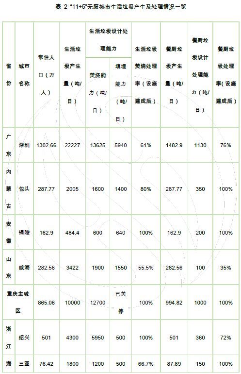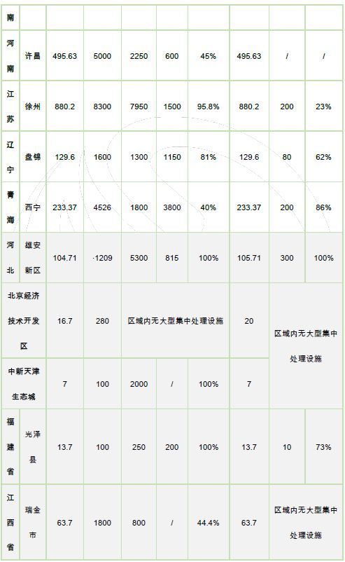 入選城市中固廢管理水平和信息公開程度差異明顯,11個(gè)試點(diǎn)城市以百萬人口級(jí)為主,是我國大多數(shù)地級(jí)市的典型代表。目前大多已有或在建有生活垃圾焚燒設(shè)施和餐廚垃圾集中處理設(shè)施。5個(gè)特例地區(qū)由于實(shí)際情況不同差異較大:雄安新區(qū)規(guī)劃處理能力、技術(shù)路線明顯較優(yōu),北京、天津兩開發(fā)區(qū)由于區(qū)域內(nèi)人口及面積所限,大多采用域協(xié)同、小型分散處理的方式,但無害化水平均相對(duì)較高,地方縣、縣級(jí)市垃圾集中處置水平有待提升。