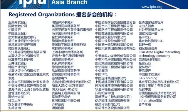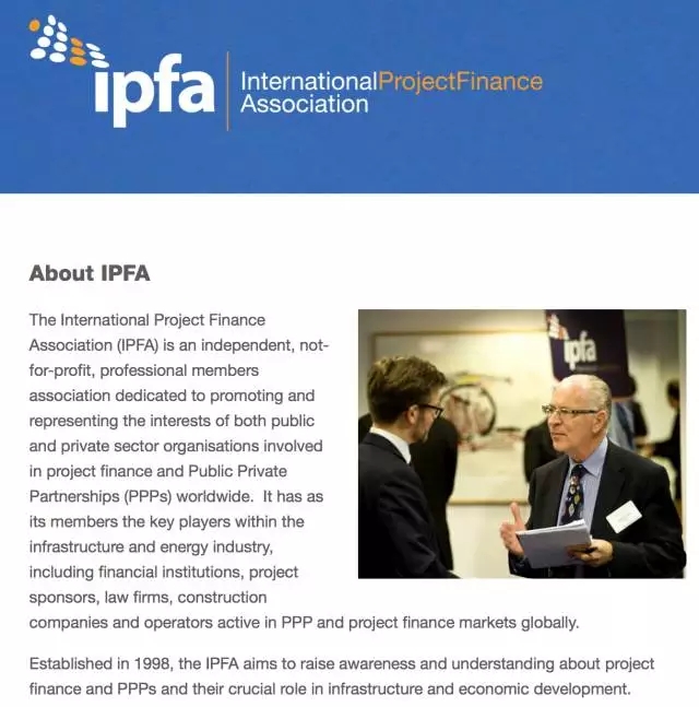 國(guó)際項(xiàng)目融資協(xié)會(huì)(IPFA)是于 1998 年 11 月在倫敦成立的非盈利性國(guó)際機(jī)構(gòu),在全球有超過600家的機(jī)構(gòu)會(huì)員,是全球最大的聚焦項(xiàng)目融資和PPP的專業(yè)網(wǎng)絡(luò)和交流平臺(tái)。其會(huì)員多是基礎(chǔ)設(shè)施建設(shè)和能源行業(yè)的主要參與者,包括金融機(jī)構(gòu)、項(xiàng)目發(fā)起人、律師事務(wù)所、建筑公司以及從事PPP項(xiàng)目的運(yùn)營(yíng)商。