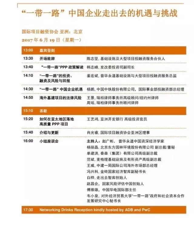 由IPFA的兩個(gè)會(huì)員機(jī)構(gòu)亞洲開發(fā)銀行和普華永道PwC聯(lián)合舉辦,邀請(qǐng)來自國(guó)家發(fā)展改革委、國(guó)際金融機(jī)構(gòu)、咨詢公司、律師事務(wù)所、智庫和中國(guó)企業(yè)等嘉賓,共同討論快速發(fā)展的國(guó)內(nèi)PPP市場(chǎng)和激增的走出去需求所帶來的機(jī)遇和挑戰(zhàn),并向中國(guó)公司提供政策解讀和專業(yè)建議。參加活動(dòng)的發(fā)言嘉賓,個(gè)個(gè)堪稱重量級(jí),如發(fā)改委投資司副司長(zhǎng)韓志鋒,亞行高級(jí)投資官員王藝?guó)?,普華永道基礎(chǔ)設(shè)施與大型項(xiàng)目投融資服務(wù)總監(jiān)姜宏斌,中國(guó)中鐵股份公司國(guó)際事業(yè)部投融資部總經(jīng)理?xiàng)铢i等等。