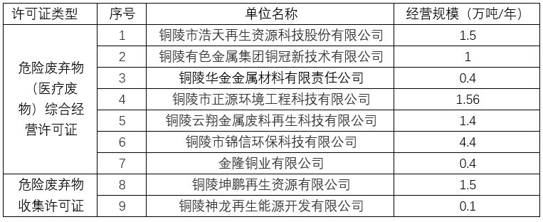 銅陵市危險廢棄物經營單位如下表所示。銅陵市危廢處置規(guī)模相對缺少。