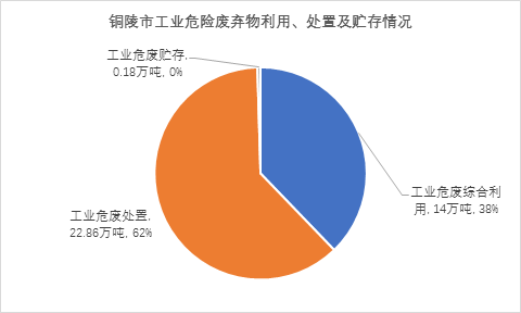 二、危險廢棄物:2017年,銅陵市產廢酸、冶煉廢物、精餾殘渣等工業(yè)危險廢棄物32.9萬噸。工業(yè)危險廢棄物利用、處置及貯存情況如下圖所示。