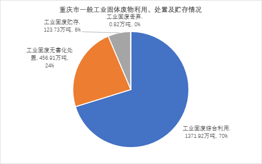 一、工業(yè)固體廢物:根據《重慶市固體廢物污染防治信息》,2017年,重慶市產生一般工業(yè)固體廢物1943.20萬噸。利用、貯存和處置情況具體見下圖。