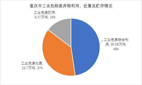 二、危險廢棄物:2017年,重慶市全市共產生工業(yè)危險廢棄物60.50萬噸,其利用、貯存和處置情況如下圖。