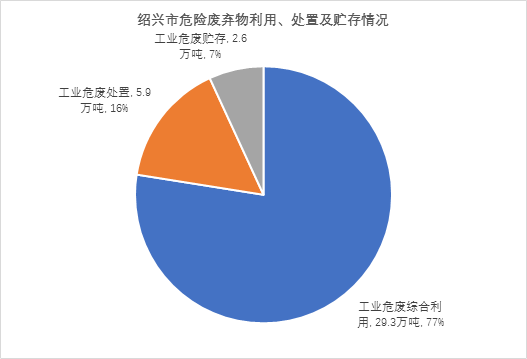 二、危險廢棄物:同年度,紹興市全市工業(yè)危險廢棄物產生量為31.9萬噸,利用、貯存和處置情況具體見下圖。