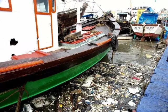 Versova海灘的部分垃圾來自于附近的街區(qū),而更大一部分來自于默拉得河(Malad Creek)的雨水排水管。河面看起來仍然很漂亮,但實際上,遠(yuǎn)岸的紅樹林,以及??吭诟咚坏?/span>漁船間隙中,是成堆成堆的垃圾。