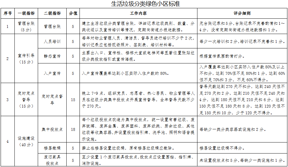 “生活垃圾分類綠色小區(qū)”指開展生活垃圾分類且成效顯著的住宅區(qū),具體條件詳見《生活垃圾分類綠色小區(qū)標準》。
