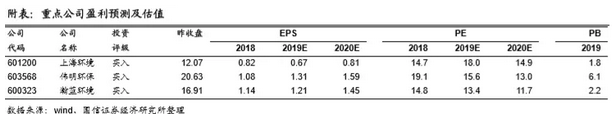 ③ 上海環(huán)境未來看點(diǎn)主要在于:1)水務(wù)和危廢資產(chǎn)注入;2)垃圾焚燒發(fā)電2020 年將迎來項目投運(yùn)高峰期,垃圾焚燒業(yè)務(wù)有望明顯放量;3)污水業(yè)務(wù)提標(biāo)改 造帶來的增量空間;4)可能的外延收購及新興領(lǐng)域的市場拓展。預(yù)計公司 2019-2021 年實現(xiàn)歸母凈利潤 5.83/7.08/8.13 億,對應(yīng) PE19/16/14 倍,給予 “買入”評級。