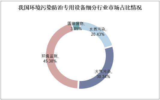 從我國(guó)我國(guó)環(huán)境污染防治專(zhuān)用設(shè)備細(xì)分行業(yè)市場(chǎng)占比情況來(lái)看,其中環(huán)境監(jiān)測(cè)占比最大,為45.38%,其次是大氣污染防治專(zhuān)用設(shè)備和水質(zhì)污染防治專(zhuān)用設(shè)備,分別占比30.34%、20.43%,