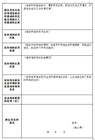 請(qǐng)?zhí)顚懖⑻峤桓郊械纳鷳B(tài)環(huán)境監(jiān)測(cè)標(biāo)準(zhǔn)制修訂建議表,每個(gè)建議表限填一個(gè)項(xiàng)目,建議表一式2份,應(yīng)由法定代表人(或委托授權(quán)人)簽字并加蓋公章。同時(shí)提交標(biāo)準(zhǔn)文本和編制說(shuō)明,格式和內(nèi)容要求參照《環(huán)境監(jiān)測(cè) 分析方法標(biāo)準(zhǔn)制修訂技術(shù)導(dǎo)則》(HJ168-2010),分析方法類標(biāo)準(zhǔn)建議還應(yīng)提交驗(yàn)證、比對(duì)的數(shù)據(jù)結(jié)果。