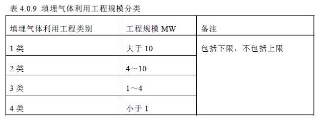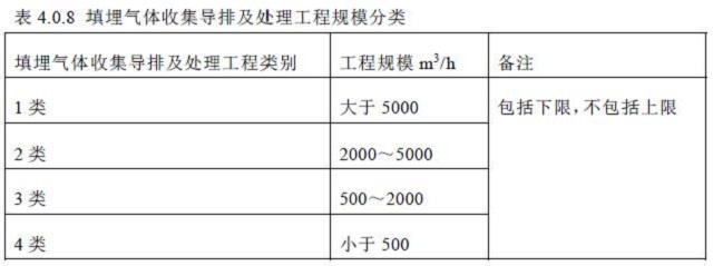 填埋氣體收集導排及處理工程規(guī)模分類應符合表4.0.8 的要求: