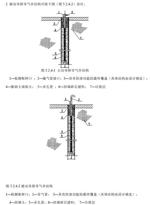 5.2.6 主動導排導氣井井口應密封。用土作為覆蓋層時,井口應采用膨潤土、粘土或混凝土等低滲透性材料密封,密封深度宜為1m-2m;用防滲膜作為覆蓋層時,井口中心導氣管與覆蓋膜連接處應進行密封處理。