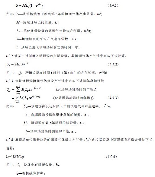 4.0.6 填埋氣體回收利用工程設計前,宜進行現(xiàn)場抽氣試驗,利用試驗數(shù)據(jù)對填埋場垃圾的產氣常數(shù)進行估算,并以此對氣體利用期間填埋氣體產生量進行逐年估算。無現(xiàn)場抽氣試驗條件的,可采用相關經驗參數(shù)和理論數(shù)學模型對填埋氣體產生量進行逐年估算。