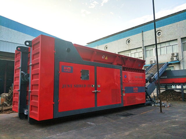 斯瑞德大件生活垃處理設(shè)備“吃進”鋼絲床墊、冰箱、油漆桶、自行車,裝著刀片的滾軸,將這些物料切分、撕碎,直至從出料口出來的是不足20厘米的碎料。