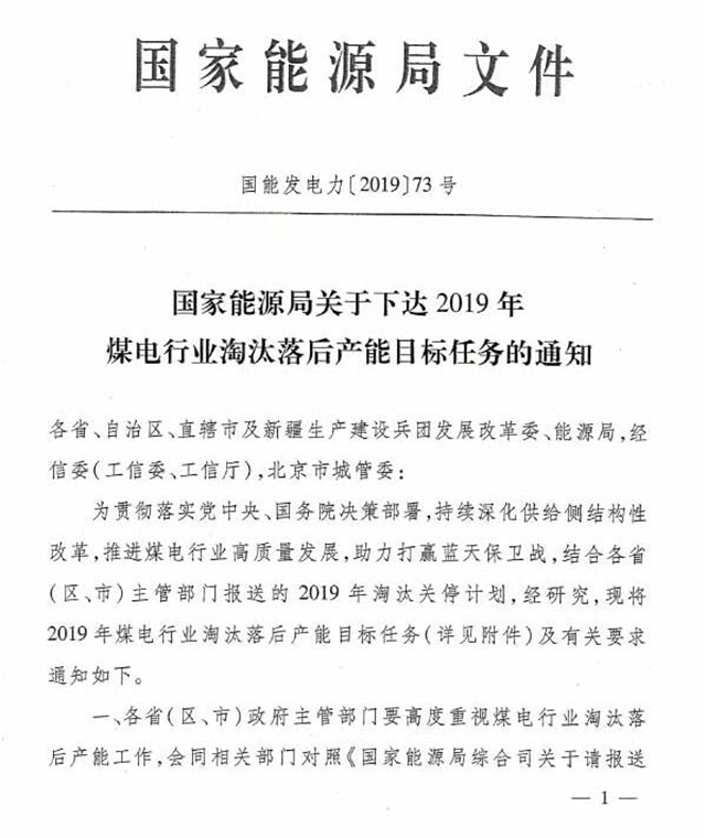 日前,國(guó)家能源局發(fā)布了《關(guān)于國(guó)家能源局關(guān)于下達(dá)2019年煤電行業(yè)淘汰落后產(chǎn)能目標(biāo)任務(wù)的通知》(以下簡(jiǎn)稱:《通知》),對(duì)今年煤電落后產(chǎn)能淘汰工作下達(dá)了任務(wù)量。