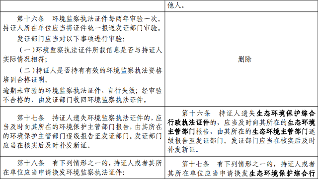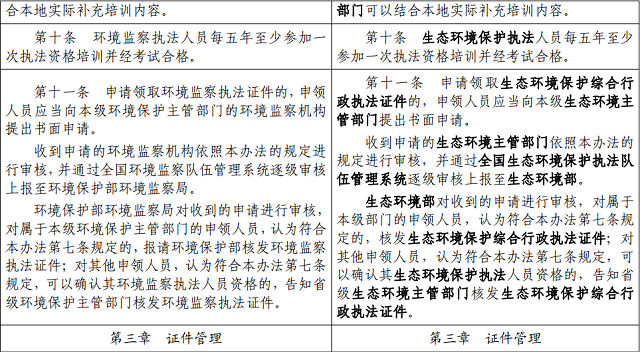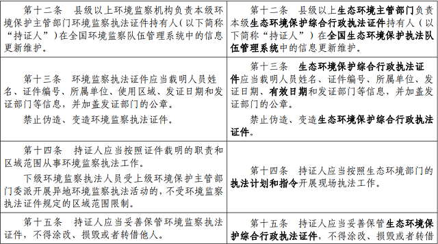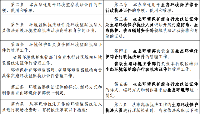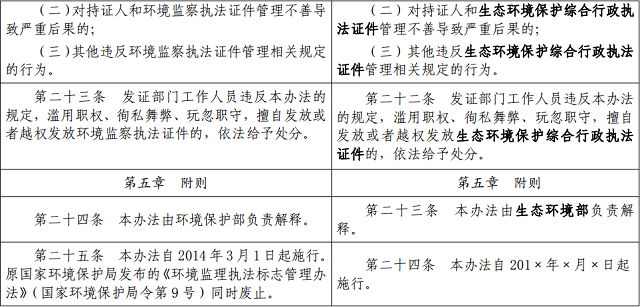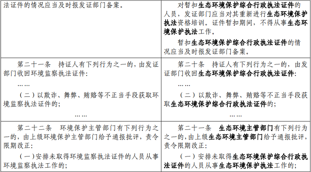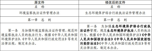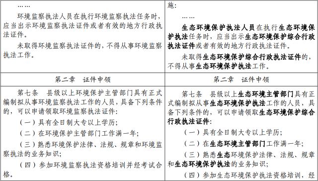 擬將23號令中“環(huán)境監(jiān)察執(zhí)法證件”修改為“生態(tài)環(huán)境保護(hù)綜合行政執(zhí)法證件”,將條文中“環(huán)境保護(hù)”修改為“生態(tài)環(huán)境”,其他條款同步作相應(yīng)修改。