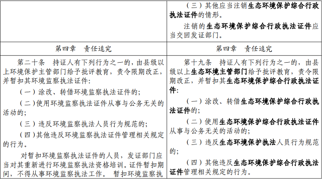 第十九條 持證人有下列行為之一的,由縣級以上生態(tài)環(huán)境主管部門給予批評教育,責(zé)令限期改正,并暫扣其生態(tài)環(huán)境保護(hù)綜合行政執(zhí)法證件: