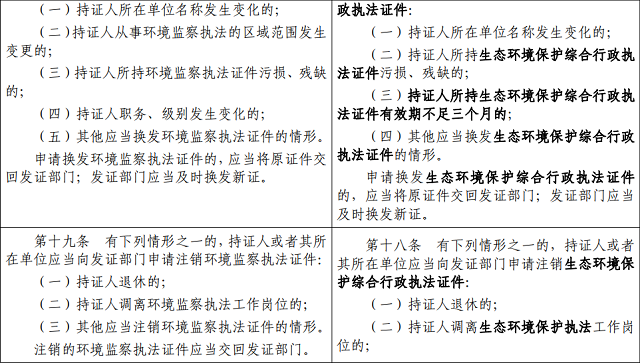 第十八條 有下列情形之一的,持證人或者其所在單位應(yīng)當(dāng)向發(fā)證部門申請注銷生態(tài)環(huán)境保護(hù)綜合行政執(zhí)法證件: