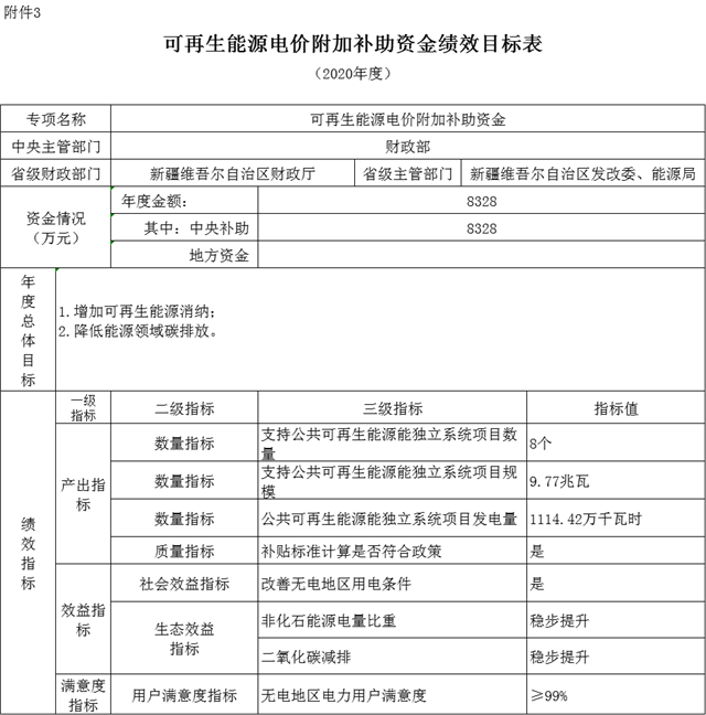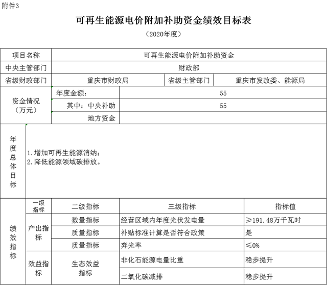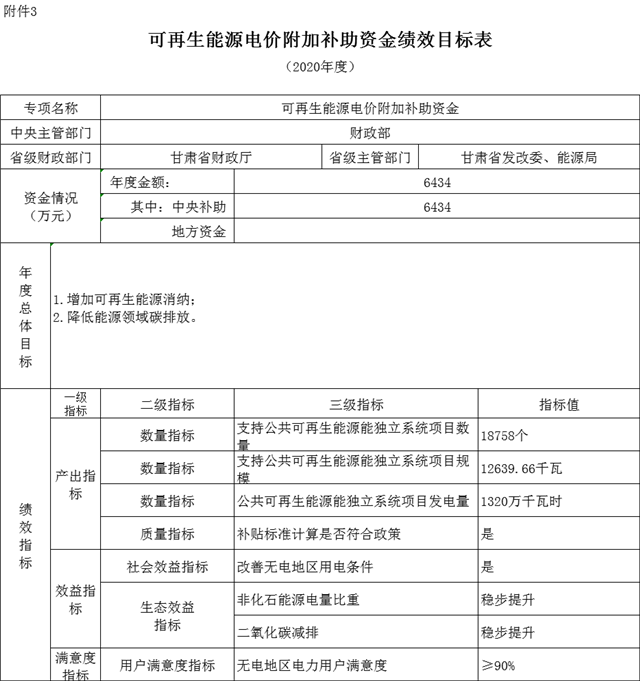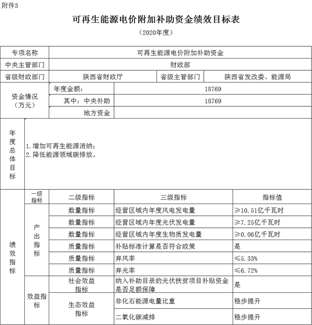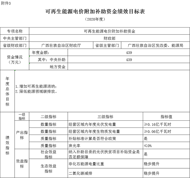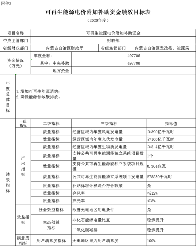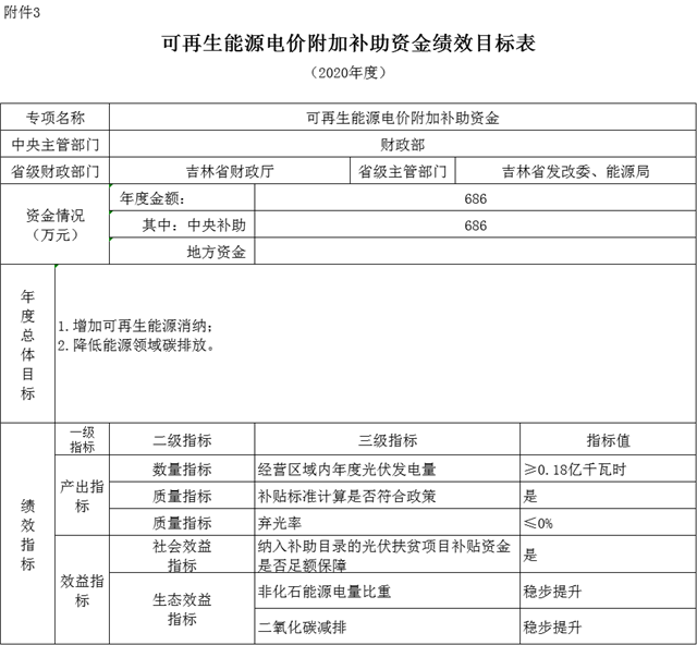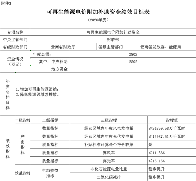 一、根據(jù)《資金管理辦法》、《財(cái)政部關(guān)于分布式光伏發(fā)電實(shí)行按照電量補(bǔ)貼政策等有關(guān)問(wèn)題的通知》(財(cái)建〔2013〕390號(hào)),以及《關(guān)于公布可再生能源電價(jià)附加資金補(bǔ)助目錄(第一批)的通知》(財(cái)建〔2012〕344號(hào))、《關(guān)于公布可再生能源電價(jià)附加資金補(bǔ)助目錄(第二批)的通知》(財(cái)建〔2012〕808號(hào))、《關(guān)于公布可再生能源電價(jià)附加資金補(bǔ)助目錄(第三批)的通知》(財(cái)建〔2012〕1067號(hào))、《關(guān)于公布可再生能源電價(jià)附加資金補(bǔ)助目錄(第四批)的通知》(財(cái)建〔2013〕64號(hào))、《關(guān)于公布可再生能源電價(jià)附加補(bǔ)助資金目錄(第五批)的通知》(財(cái)建〔2014〕489號(hào))、《關(guān)于公布可再生能源電價(jià)附加補(bǔ)助資金目錄(第六批)的通知》(財(cái)建〔2016〕669號(hào))、《關(guān)于公布可再生能源電價(jià)附加補(bǔ)助資金目錄(第七批)的通知》(財(cái)建〔2018〕250號(hào))、《關(guān)于公布可再生能源電價(jià)附加補(bǔ)助資金目錄(光伏扶貧項(xiàng)目)的通知》(財(cái)建〔2019〕48號(hào)),現(xiàn)提前下達(dá)你廳(局)2020年可再生能源電價(jià)附加補(bǔ)助地方資金預(yù)算(項(xiàng)目代碼:Z175060070001),列2020年支出功能分類科目:“2116001 風(fēng)力發(fā)電補(bǔ)助”、“2116002 太陽(yáng)能發(fā)電補(bǔ)助”、“2116003 生物質(zhì)能發(fā)電補(bǔ)助”,支出經(jīng)濟(jì)分類科目“50799其他對(duì)企業(yè)補(bǔ)助”,具體金額及支付方式見(jiàn)附件。待2020年預(yù)算年度開(kāi)始后,按程序撥付使用。