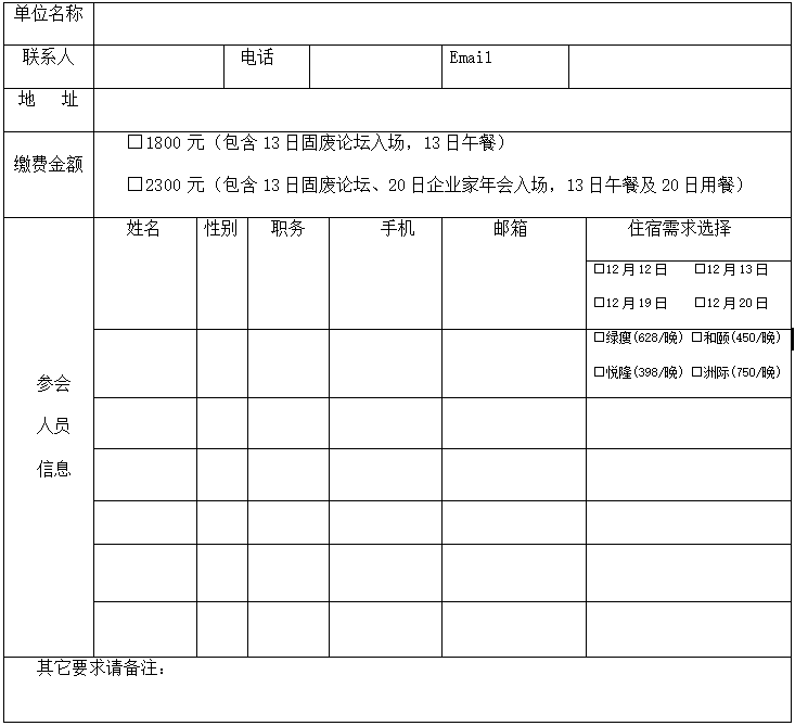 參會代表交通及住宿費用自理。請將注冊費匯款到指定賬戶并于2019年12月11日前并發(fā)參會回執(zhí)(附件2)至?xí)?wù)組郵箱:zghl@envirunion.com。