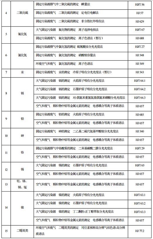 8.2.4 大氣污染物濃度監(jiān)測(cè)時(shí)的測(cè)定方法采用表5所列的方法標(biāo)準(zhǔn)。本標(biāo)準(zhǔn)實(shí)施后國(guó)家發(fā)布的污染物監(jiān)測(cè)方法標(biāo)準(zhǔn),如適用性滿(mǎn)足要求,同樣適用于本標(biāo)準(zhǔn)相應(yīng)污染物的測(cè)定。
