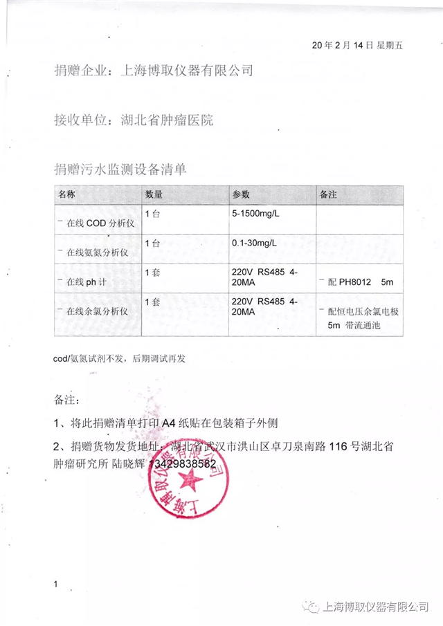 為更好地讓武漢當(dāng)?shù)蒯t(yī)院救治更多的患者,確保疫情消滅成果,堅決打贏疫情防控阻擊戰(zhàn),上海博取儀器有限公司決定為湖北省腫瘤醫(yī)院捐贈一批水質(zhì)監(jiān)測儀器儀表,在線COD分析儀、在線氨氮分析儀、在線PH計、在線余氯,作為一個有社會責(zé)任感的企業(yè),上海博取儀器堅決跟隨國家腳步抗擊此次疫情,為了能讓武漢重見光明,也盡一份綿薄之力。