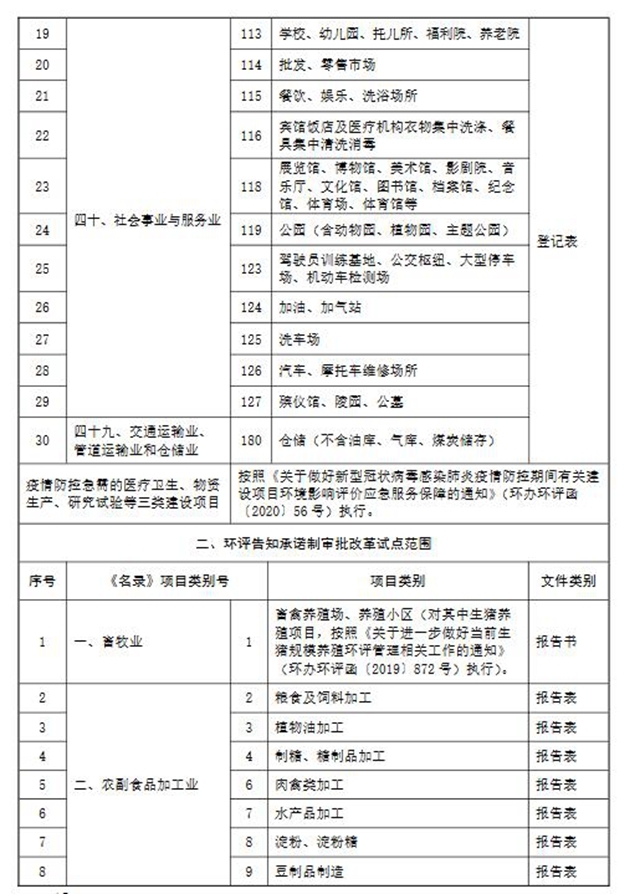 豁免部分項目環(huán)評手續(xù)辦理。繼續(xù)落實好已出臺的新冠肺炎疫情防控期間急需的醫(yī)療衛(wèi)生、物資生產(chǎn)、研究試驗等三類建設項目環(huán)評應急服務保障政策。加強與排污許可制銜接,對照《建設項目環(huán)境影響評價分類管理名錄》(以下簡稱《名錄》),對關系民生且納入《固定污染源排污許可分類管理名錄(2019年版)》實施排污許可登記管理的相關行業(yè),以及社會事業(yè)與服務業(yè),不涉及有毒、有害及危險品的倉儲、物流配送業(yè)等10大類30小類行業(yè)的項目,不再填報環(huán)境影響登記表。