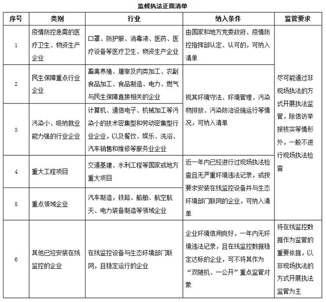 免除部分企業(yè)現(xiàn)場執(zhí)法檢查。對與疫情防控物資生產(chǎn)和民生保障密切相關的,污染排放量小、吸納就業(yè)能力強的,涉及重大工程和重點領域的管理規(guī)范、環(huán)境績效水平高的企業(yè),不進行現(xiàn)場執(zhí)法檢查。
