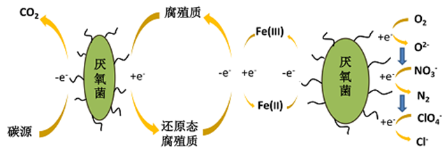 利用醌類物質(zhì)及其聯(lián)合氧化鐵的電子穿梭作用和腐殖質(zhì)中醌類結(jié)構(gòu)大量存在的特點,通過在厭氧生物體系中加入腐殖質(zhì)或者同時加入腐殖質(zhì)和氧化鐵,促進體系中的電子傳遞效率,達到顯著提升高氯酸鹽/硝酸鹽還原效率的效果。
