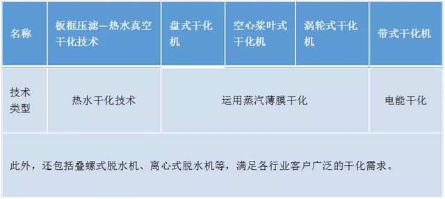 污泥干化可分為機械干化和熱干化兩大類型,機械干化是通過機械脫水設備進行物理干化的工藝,因其發(fā)展歷史悠久,現(xiàn)在市場上已出現(xiàn)板框、槳葉和原盤式干化機。熱干化顧名思義是利用熱源對污泥直接或間接進行水分蒸發(fā)干化,直接制造熱源的成本通常比機械干化高。