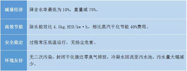 污泥經(jīng)低溫干化過程冷凝出來的污水,直接回流到原來的污水池,避免直接排放帶來二次污染的環(huán)保問題。干污泥含水率相比其他機械脫水能降至較低含水率,污泥的體量大幅度減少,這可為因固廢處置費用飛漲的排污單位節(jié)省非??捎^的環(huán)保成本。