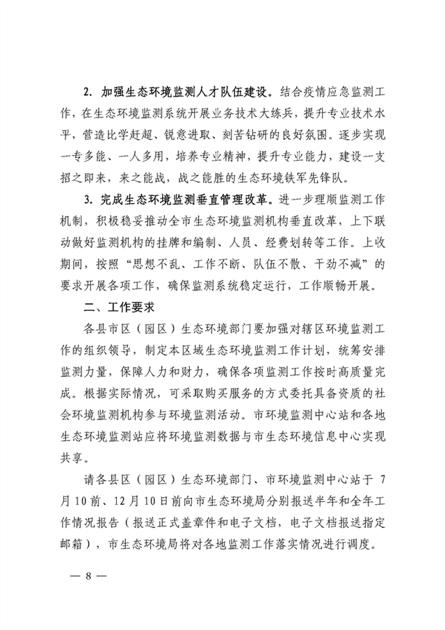 為認真貫徹全國生態(tài)環(huán)境監(jiān)測工作會議、全省生態(tài)環(huán)境保護和全省生態(tài)環(huán)境系統(tǒng)全面從嚴治黨工作視頻會議精神,全面落實《2020年國家生態(tài)環(huán)境監(jiān)測方案》《四川省2020年生態(tài)環(huán)境工作要點》《2020年四川省生態(tài)環(huán)境監(jiān)測方案》要求,進一步做好2020年全市生態(tài)環(huán)境監(jiān)測工作,現(xiàn)將《2020年綿陽市生態(tài)環(huán)境監(jiān)測方案》印發(fā)給你們,請認真貫徹執(zhí)行?,F(xiàn)將相關(guān)事項通知如下。