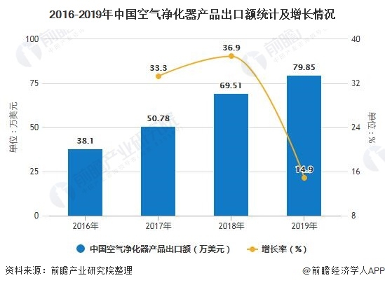 2016-2019年中國空氣凈化器行業(yè)產(chǎn)品出口額不斷增長,2018年中國空氣凈化器產(chǎn)品出口額為69.51萬美元,同比增長36.9%,2019年中國空氣凈化器產(chǎn)品出口額為79.85萬美元,同比增長14.9%,增速相較于2018年有所減緩。