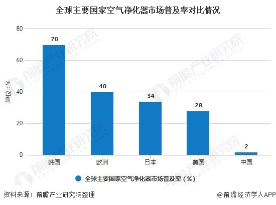 目前,發(fā)達國家空氣凈化器的普及率遠高于發(fā)展中國家,其中韓國的普及率達到了70%,歐洲空氣凈化器的普及率為40%,美國空氣凈化器的普及率為28%,日本空氣凈化器的普及率為34%,而中國的空氣質(zhì)量遠不及上述國家,空氣凈化器的普及率卻僅有2%。因此我國空氣凈化器市場潛力巨大,作為功能性較強的產(chǎn)品,空氣凈化器不斷拓展產(chǎn)品功能和質(zhì)量,未來行業(yè)有望向智能化和功能創(chuàng)新化方向發(fā)展。