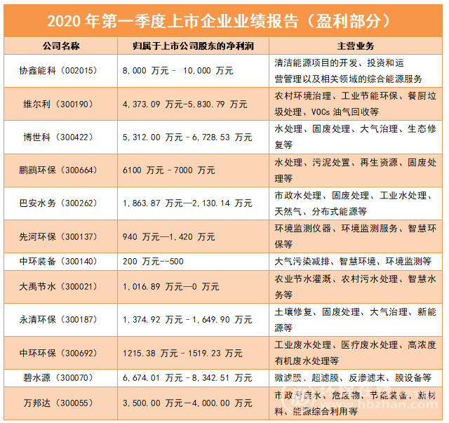日前,多個環(huán)保企業(yè)發(fā)布了2020年第一季度(2020年1月1日-3月31日)的業(yè)績報告或預告。受疫情影響,很多工程項目等開工延遲、訂單減少,從而影響了很多環(huán)保企業(yè)的業(yè)績。但仍有很多企業(yè)實現(xiàn)了盈利,具體有哪些企業(yè)呢?