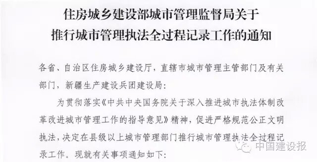 各省、自治區(qū)住房城鄉(xiāng)建設(shè)廳,直轄市城市管理主管部門(mén)及有關(guān)部門(mén),新疆生產(chǎn)建設(shè)兵團(tuán)建設(shè)局:為貫徹落實(shí)《中共中央國(guó)務(wù)院關(guān)于深入推進(jìn)城市執(zhí)法體制改革改進(jìn)城市管理工作的指導(dǎo)意見(jiàn)》精神,促進(jìn)嚴(yán)格規(guī)范公正文明執(zhí)法,決定在縣級(jí)以上城市管理部門(mén)推行城市管理執(zhí)法全過(guò)程記錄工作。現(xiàn)就有關(guān)事項(xiàng)通知如下:各地城市管理部門(mén)要通過(guò)文字、音像等記錄方式,對(duì)執(zhí)法活動(dòng)全過(guò)程進(jìn)行記錄,客觀(guān)、公正、完整地記錄執(zhí)法工作情況和相關(guān)證據(jù),實(shí)現(xiàn)全過(guò)程留痕和可回溯管理。規(guī)范執(zhí)法文書(shū)的制作和使用,確保執(zhí)法文書(shū)和案卷完整準(zhǔn)確、合法規(guī)范。合理配備并使用執(zhí)法記錄儀等現(xiàn)場(chǎng)執(zhí)法記錄設(shè)備和視音頻資料傳輸、存儲(chǔ)、等設(shè)備。對(duì)現(xiàn)場(chǎng)執(zhí)法活動(dòng)中容易引發(fā)爭(zhēng)議和糾紛的,應(yīng)當(dāng)實(shí)行全過(guò)程音像記錄。積極利用大數(shù)據(jù)、云計(jì)算、物聯(lián)網(wǎng)等信息技術(shù),結(jié)合數(shù)字化城市管理平臺(tái)建設(shè)和辦公自動(dòng)化系統(tǒng)建設(shè)等,探索成本低、效果好、易保存、不能刪改的音像記錄方式,提高執(zhí)法記錄的信息化水平。做好執(zhí)法文書(shū)和視音頻資料的管理和存儲(chǔ),逐步實(shí)現(xiàn)與數(shù)字化城市管理信息系統(tǒng)關(guān)聯(lián)共享。建立健全執(zhí)法全過(guò)程記錄保存、管理、使用等工作制度。定期組織對(duì)執(zhí)法文書(shū)和視音頻資料進(jìn)行抽查檢查。充分發(fā)揮全過(guò)程記錄信息在案卷評(píng)查、數(shù)據(jù)統(tǒng)計(jì)分析、執(zhí)法監(jiān)督等工作中的作用。各地要充分認(rèn)識(shí)推行城市管理執(zhí)法全過(guò)程記錄工作的重要意義,切實(shí)落實(shí)工作要求,配備相關(guān)儀器設(shè)備,嚴(yán)格規(guī)范記錄行為,妥善保管使用記錄信息,確保執(zhí)法全過(guò)程記錄工作有效推行。住房城鄉(xiāng)建設(shè)部城市管理監(jiān)督局