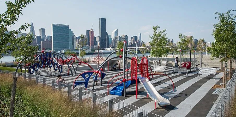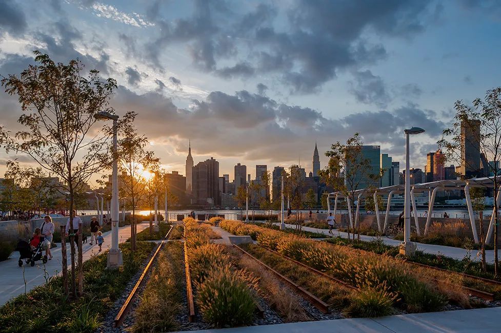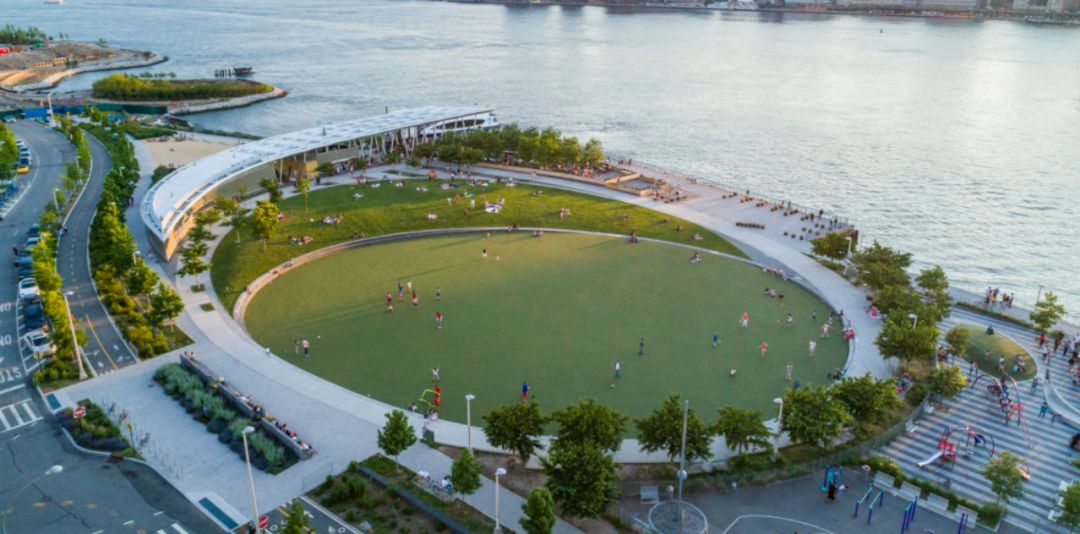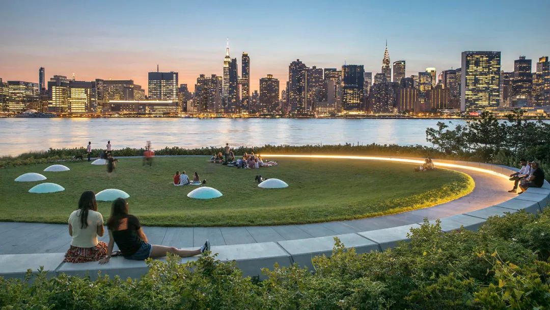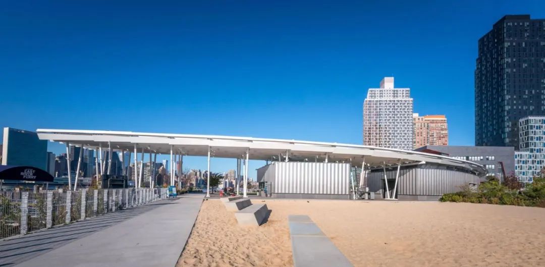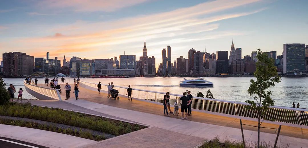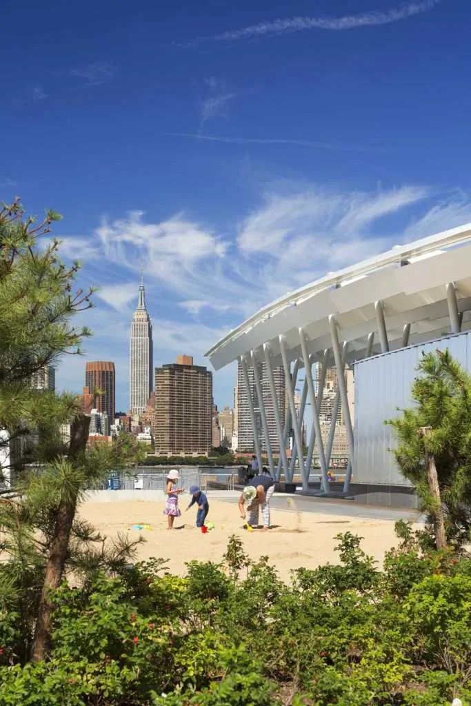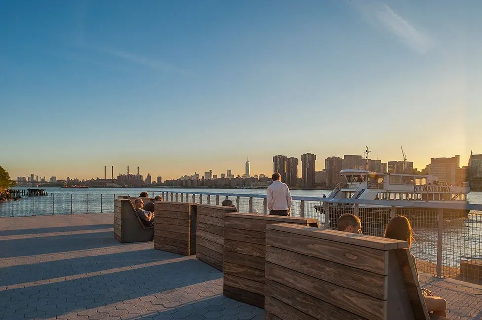 城市沙灘:在遮蔭長廊和公園步道的圍合中,一處充滿著休閑氛圍的城市沙灘為人們提供了日光浴、野餐、打沙灘排球的理想活動場地。在這里,游人們可以盡情地赤腳踏沙,嬉戲玩鬧間還可欣賞到曼哈頓天際處獨特的濱水落日景觀。