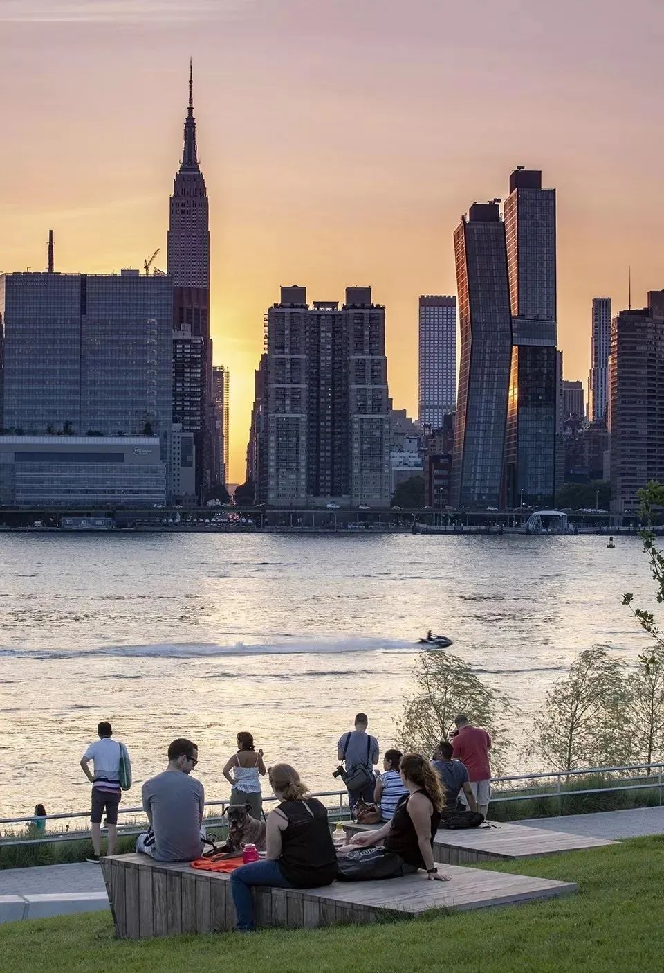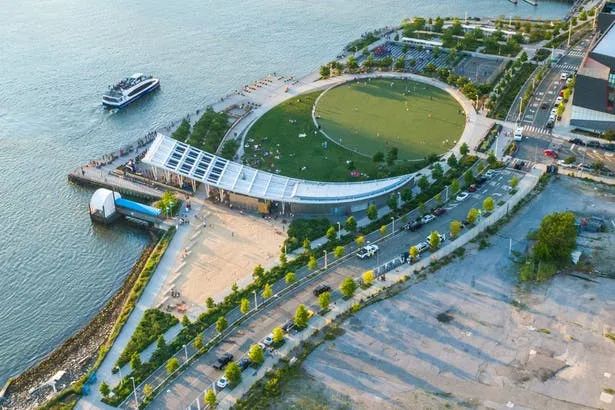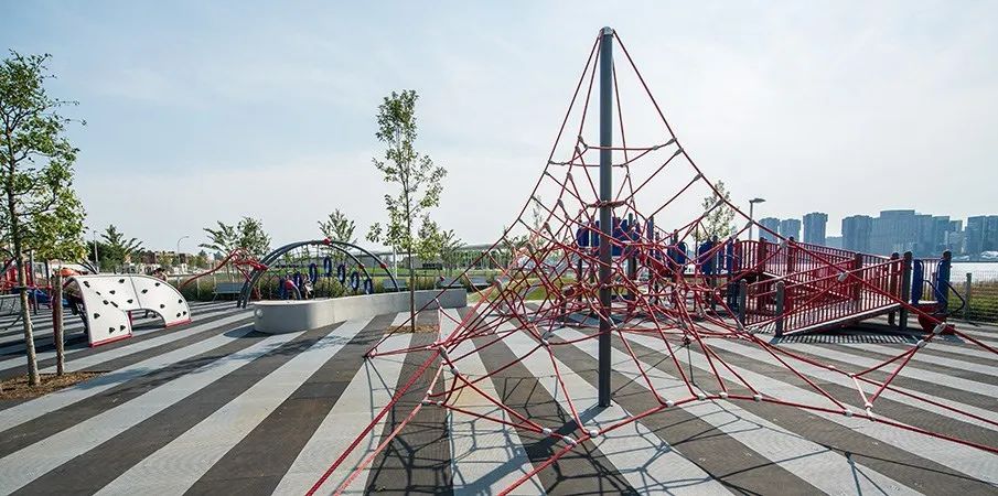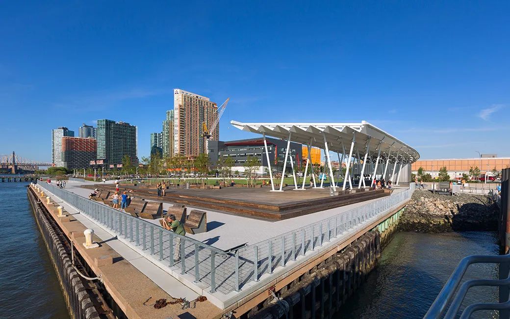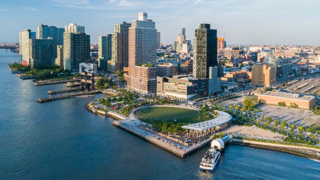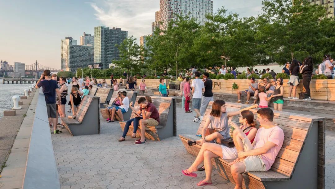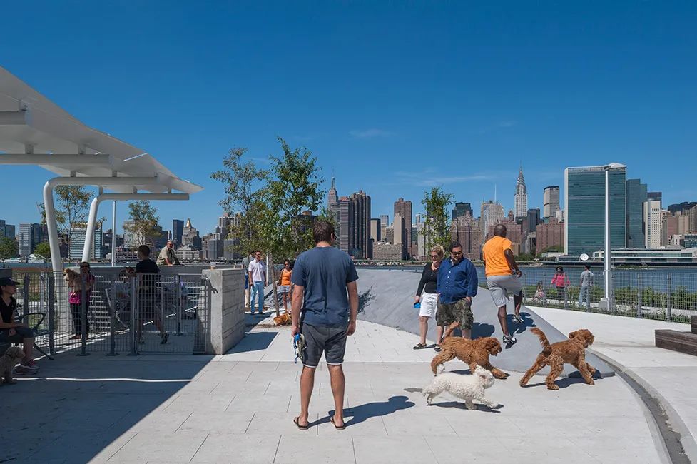 城市沙灘:在遮蔭長廊和公園步道的圍合中,一處充滿著休閑氛圍的城市沙灘為人們提供了日光浴、野餐、打沙灘排球的理想活動場地。在這里,游人們可以盡情地赤腳踏沙,嬉戲玩鬧間還可欣賞到曼哈頓天際處獨特的濱水落日景觀。