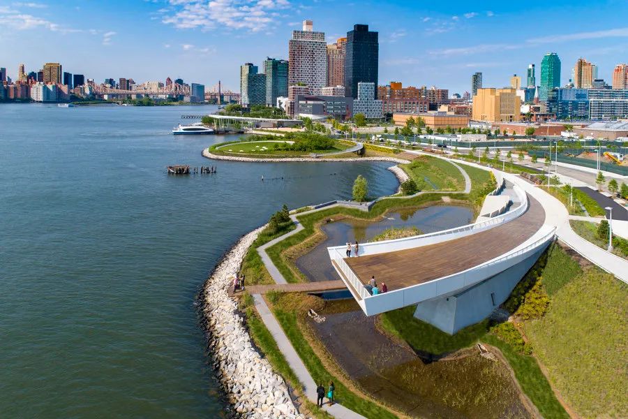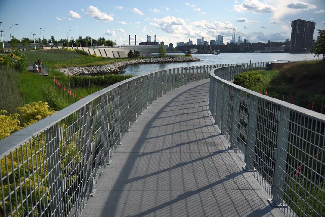 公園的二期工程起始于第54大道以南,整個設計地形豐富,通過不同的地勢,營造了許多有趣的空間。它包括一個半島空間、一個皮劃艇碼頭、幾個可以鍛煉和野餐的露臺,還有一個盤旋在濕地上空出挑的休息平臺,站在上面可以欣賞曼哈頓迷人的天際線。