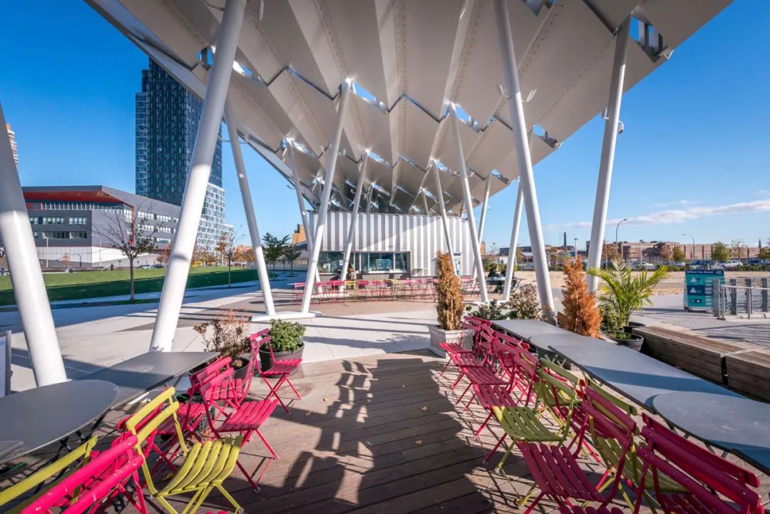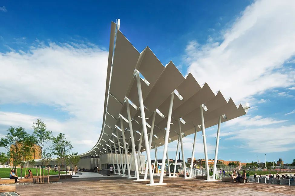 橢圓形草坪:多功能橢圓綠地構成了公園中最為開闊的中心區(qū)域,這里不僅可以舉辦各種活動,同時也可以在草坪上欣賞曼哈頓的天際線。這一橢圓綠地形成公園的南北分界,南北沿邊各有一條曲度成弧狀的道路設施,北邊是一條綿長的林蔭步道,而南邊是帶有褶皺式鋼筋頂棚的遮蔭廊道。廊道包括兩個部分,一部分作為公園的運營和維護點,另一部分則作為休閑場所,為游人提供必要的休閑地點。該設計面向未來,運用新的技術手段,可收集雨水和太陽能,收集的雨水可以滋養(yǎng)周圍的生物,而太能能為整個公園提供50%以上的供電。同時頂棚可以容納更多的面板,將在未來為公園提供100%的供電。