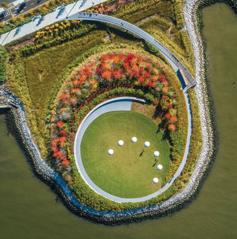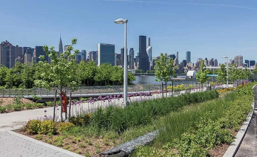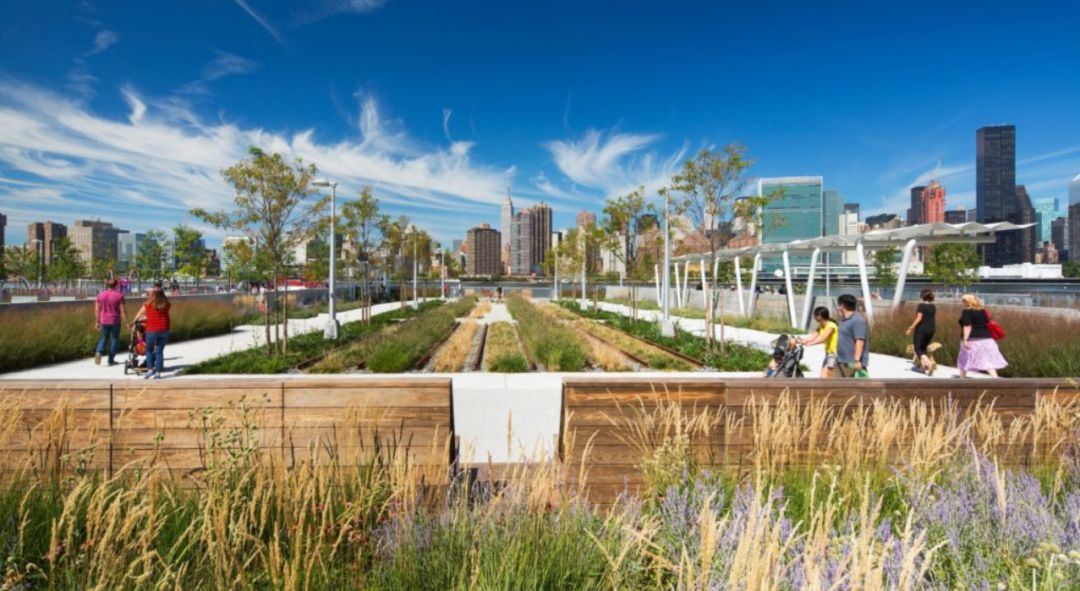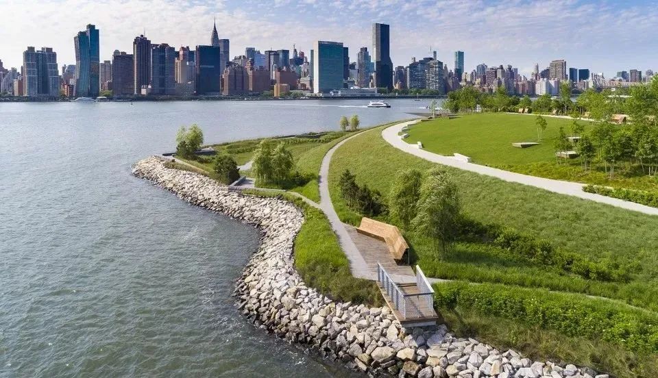 而隨著經濟的發(fā)展,可持續(xù)開發(fā)成為獵人角南濱再次崛起的重要契機。這塊基地位于紐約市皇后區(qū)的東河(the East River)沿岸,三面環(huán)水,既是城市的濱水區(qū)和門戶區(qū),也是動植物的棲息之所,更是一處自然景致迷人的待開發(fā)區(qū)域。于是,獵人角南濱公園被列為長島市東江總體規(guī)劃中,基于這些場地歷史背景,全新的濱水區(qū)設計結合了許多綠色環(huán)保元素及舉措,將這處早已廢棄卻坐擁重要地理位置的濱水區(qū)改造成新型城市生態(tài)示范區(qū)。
