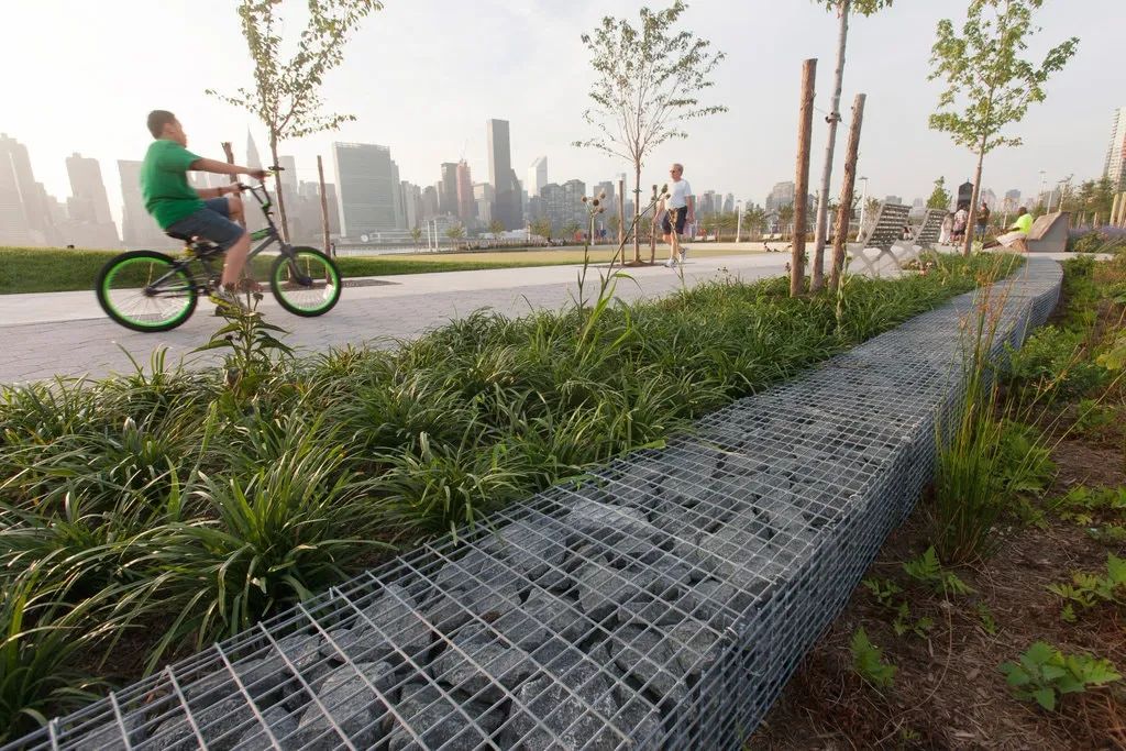 生態(tài)調節(jié)溝和石籠:生態(tài)調節(jié)溝位于公園邊緣,將中心大道和智能街道的雨水過濾,而石籠則是在漲潮時,過濾掉海水帶來的垃圾。