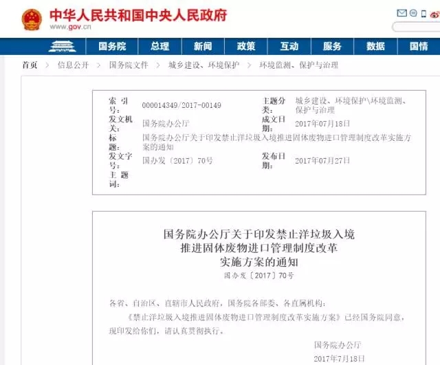 7月27日,國務(wù)院辦公廳正式發(fā)布禁止洋垃圾入境推進(jìn)固體廢物進(jìn)口管理制度改革實施方案。明確2017年年底前,全面禁止進(jìn)口環(huán)境危害大、群眾反映強烈的固體廢物;2019年年底前,逐步停止進(jìn)口國內(nèi)資源可以替代的固體廢物。