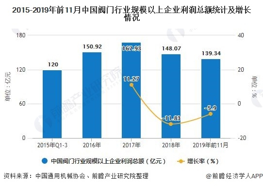 2015-2017年,我國(guó)閥門行業(yè)規(guī)模以上企業(yè)主營(yíng)收入規(guī)模持續(xù)上升,2017年達(dá)到2486.3億元,同比增長(zhǎng)8.17%,達(dá)到近5年來(lái)最高;2018-2019年,受到貿(mào)易戰(zhàn)影響,國(guó)際市場(chǎng)受阻,2019年1-11月,我國(guó)閥門行業(yè)柜上企業(yè)實(shí)現(xiàn)主營(yíng)收入1788.23億元,雖然營(yíng)收持續(xù)下滑,但增速出現(xiàn)回升趨勢(shì)。
