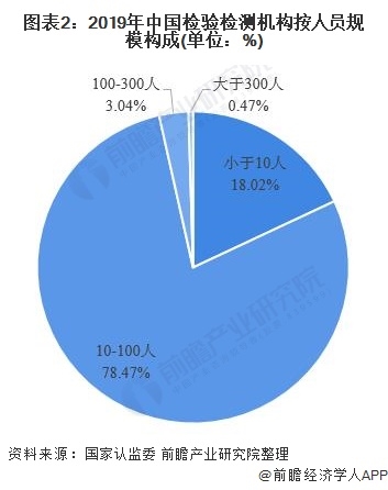 雖然我國(guó)檢驗(yàn)檢測(cè)產(chǎn)業(yè)規(guī)模不斷擴(kuò)大、產(chǎn)業(yè)結(jié)構(gòu)持續(xù)優(yōu)化、科研創(chuàng)新能力不斷增強(qiáng),但“小、散、弱”的基本面貌仍未改變。目前,我國(guó)檢驗(yàn)檢測(cè)機(jī)構(gòu)主要以規(guī)模在10-100人的為主,2019年,全國(guó)10-100人的檢驗(yàn)檢測(cè)機(jī)構(gòu)占78.47%,而100-300人的檢驗(yàn)檢測(cè)機(jī)構(gòu)僅占3.04%;300人以上的更是不足1%。