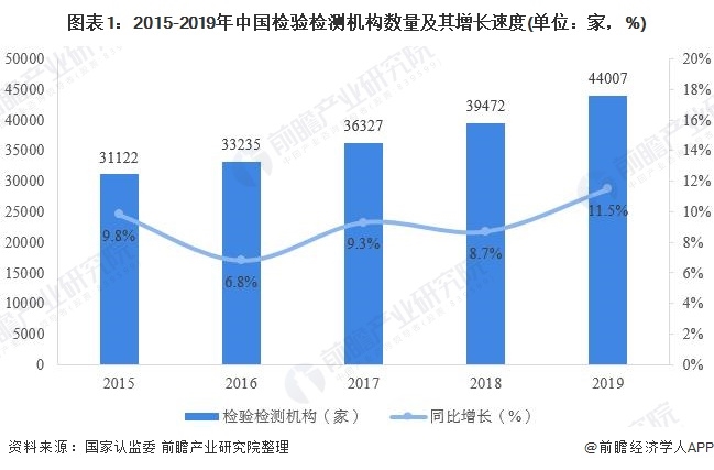 據(jù)國(guó)家認(rèn)監(jiān)委統(tǒng)計(jì)數(shù)據(jù)顯示,2015年以來(lái),我國(guó)檢驗(yàn)檢測(cè)機(jī)構(gòu)數(shù)量持續(xù)增長(zhǎng),截至到2019年底,全國(guó)檢驗(yàn)檢測(cè)機(jī)構(gòu)數(shù)量突破4萬(wàn)家,達(dá)到44007家,同比增長(zhǎng)11.5%。