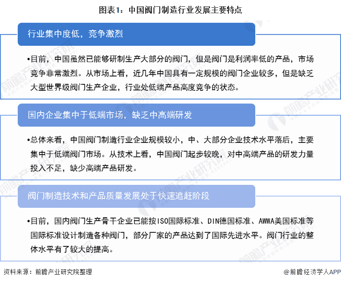 閥門是一種壓力管道元件,它是用來改變管路斷面和戒指流動方向、控制輸送介質(zhì)的壓力、流量、溫度的一種裝置,具有導流、截流、調(diào)節(jié)、防止倒流、分流或溢流卸壓等功能,廣泛應用于國民經(jīng)濟的各個主要領域。從我國閥門制造行業(yè)的發(fā)展特點來看,我國閥門制造行業(yè)集中度較低,競爭相對激烈,國內(nèi)企業(yè)集中于低端市場,缺乏中高端研發(fā),閥門制造技術和產(chǎn)品質(zhì)量發(fā)展處于快速追趕階段。