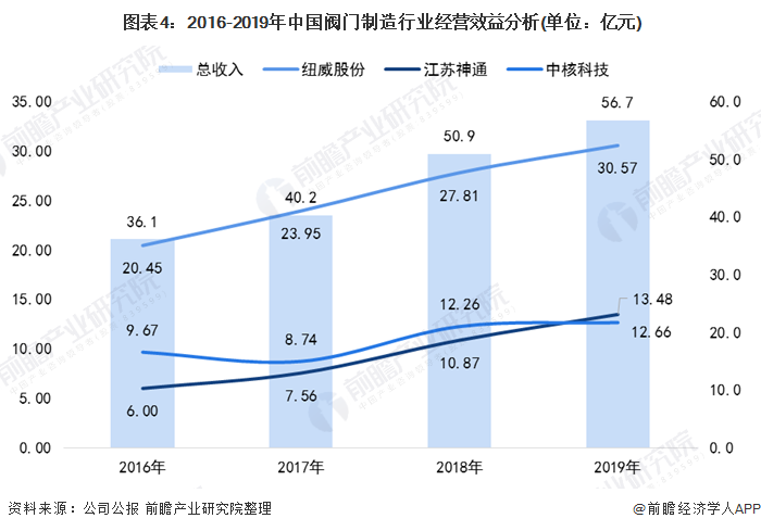 紐威股份、江蘇神通、中核科技等企業(yè)為我國閥門制造行業(yè)的領先企業(yè)。以紐威股份、江蘇神通、中核科技為例,計算我國閥門制造行業(yè)總體經(jīng)營效益情況。2016-2019年,我國閥門制造行業(yè)營業(yè)收入逐年提高。2019年,三家企業(yè)營業(yè)總收入達56.7億元,其中,紐威股份營收最高,為30.57億元,其次為江蘇神通,營業(yè)收入達13.48億元。綜合來看,3家企業(yè)經(jīng)營效益相對較好。
