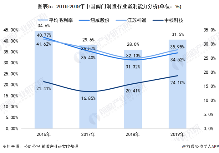 以紐威股份、江蘇神通、中核科技為例,計算我國閥門制造行業(yè)盈利能力情況。2016-2019年,我國閥門制造行業(yè)平均毛利率波動變化。2019年,三家企業(yè)平均毛利率約為31.5%,其中,江蘇神通毛利率最高,為35.95%,其次為紐威股份,毛利率達34.52%。綜合來看,企業(yè)產(chǎn)品盈利性相對較高。
