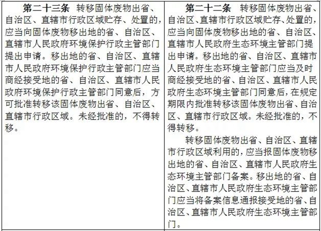 即除原來的固體廢物轉移出省貯存、處置需經(jīng)轉移審批外,固體廢物轉移出省利用的也要報移出地省級生態(tài)環(huán)境部門備案,移出地省級生態(tài)環(huán)境部門還要將備案信息通報移入地省生態(tài)環(huán)境部門。
