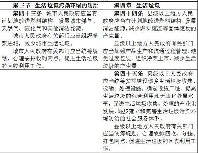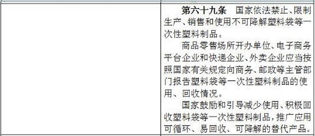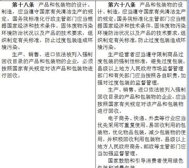 特別是新增了生活垃圾分類方面的條款,明確了生產(chǎn)企業(yè)要避免商品過度包裝、快遞業(yè)要優(yōu)先采用可重復包裝物、限制生產(chǎn)銷售使用一次性塑料制品等要求。特別明確了禁止向生活垃圾收集設施投放工業(yè)固體廢物。